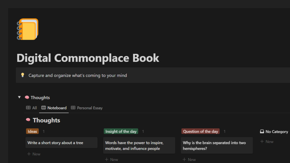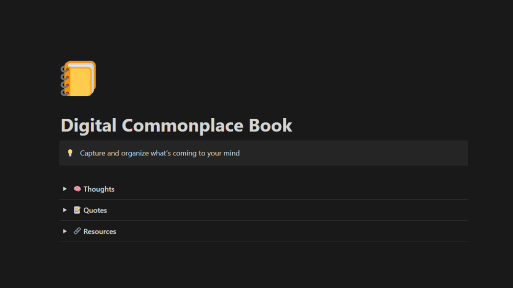 Simplify your creative process and enhance productivity with our easy-to-use template. Embrace a streamlined approach to managing your thoughts, quotes, and resources. Start building your digital commonplace and second brain today!